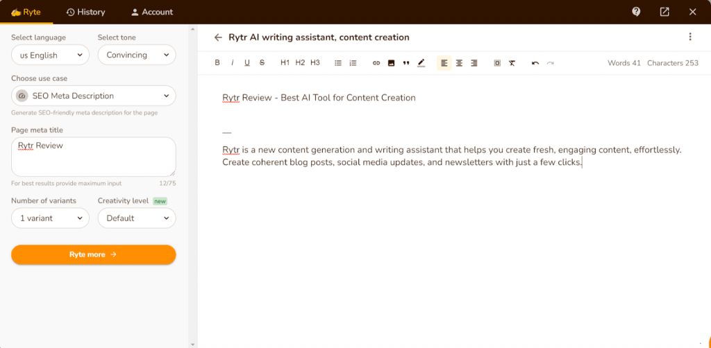 Along with that, you can also tweak the variants and creativity level options. After that, click on the ryte for me button.